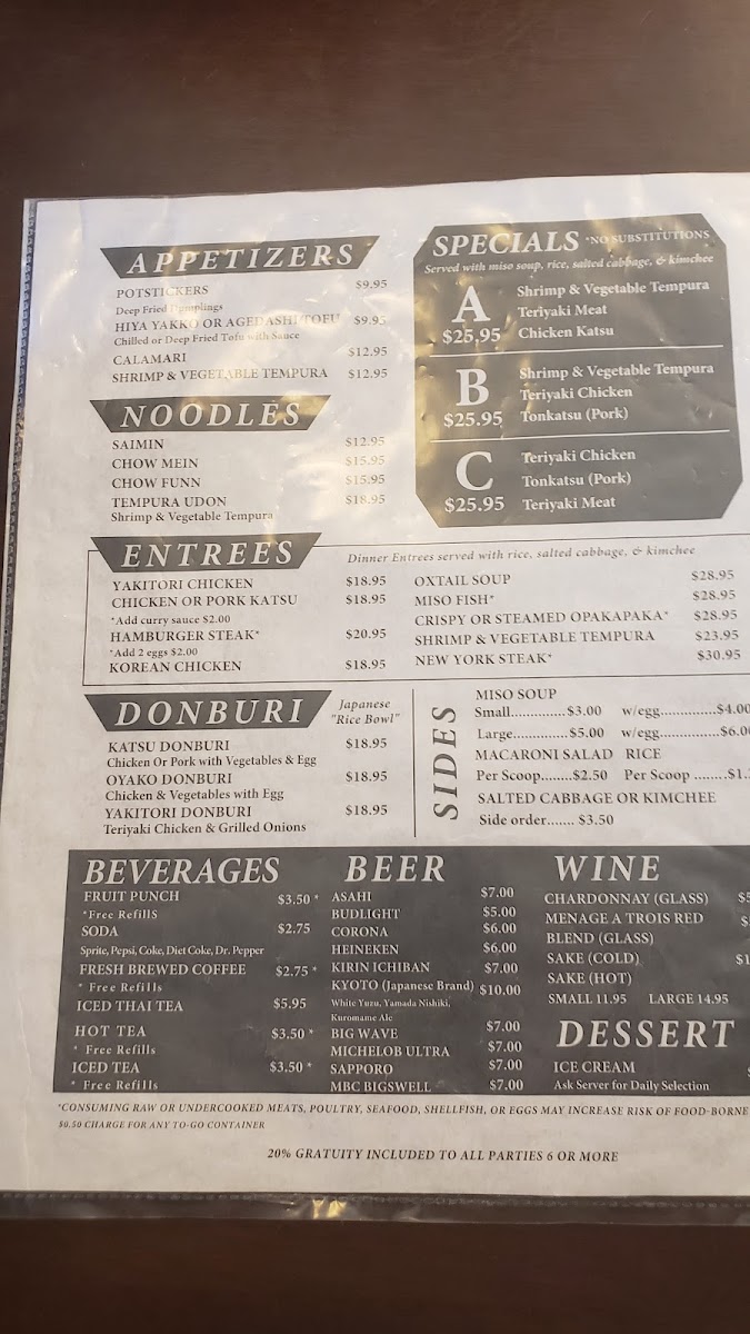 The menu also includes hearty options such as teriyaki chicken, chicken katsu donburi, and mixed tempura, making it easy to find satisfying meals any time of day. Whether you're stopping by for a quick meal before a flight or settling in for a laid-back dinner with friends or family, there’s a comforting and familiar rhythm to the dishes that fits well with the friendly atmosphere.